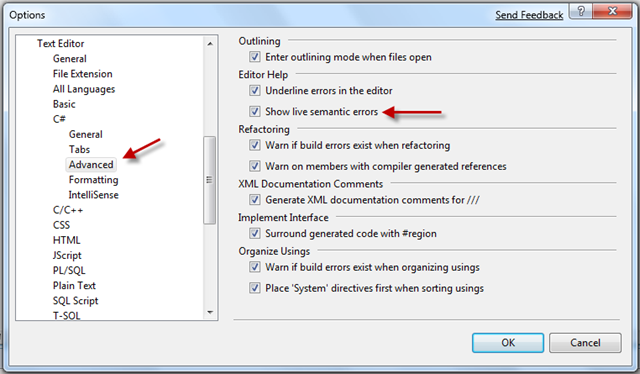 A new feature in the Visual Studio 2008 service pack 1, is background compilation of code to check for errors as it’s written. This facility has existed in Visual Basic for some time now, though I doubt it was ever this fast. What you get in the IDE is a red squiggle (similar to a spell check error) notifying the programmer a mistake is made. In this example I am mistakenly trying to assign a string value to an integer.