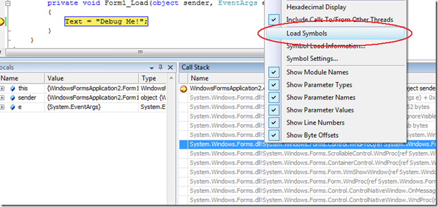 After wasting an hour or so I have bumped into an annoying limitation of the new Visual Studio.NET 2008 Service Pack 1. When one attempts to load the Symbols you get a messagebox dialogue saying "There is no source code available for the current location"